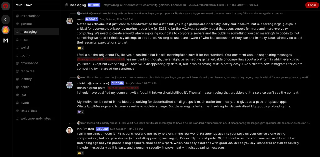 Commune works well with bridged rooms, and is able to make any bridged matrix room publicly accessible, as long as the permissions are set up correctly. This means Discord or IRC communities bridged to matrix can also be accessed from the client, indexed by Google and so on.